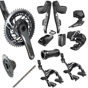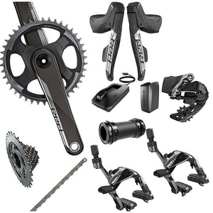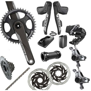 Shifters/Brake levers, brake calipers, Front Derailleur (2x group only), Rear Derailleur, 160mm Rotors, Batteries, Charger/cord, Chain, Cassette, Crankset and Quick Start Guide