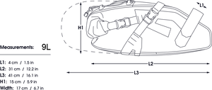 9L version: Length min 31 cm > max 41 cm | Height 15 cm | Width 17 cm | Weight 325g