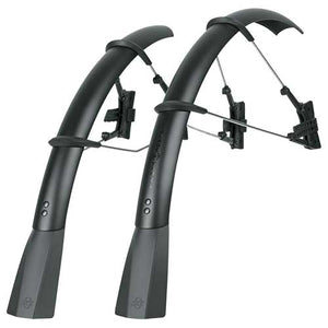 SKS Raceblade Fenders complete with stays and all mounting components. Fenders for racers: whether for winter training or a bike tour in the summer rain – the ultralight SKS RACEBLADE mudguard made of high-performance impact-resistant plastic with an extra long spoiler offers perfect all-round protection. The double-jointed quick-release fitting system is not only quick to mount but also fits on aero forks and frames. Made in Germany.
