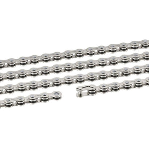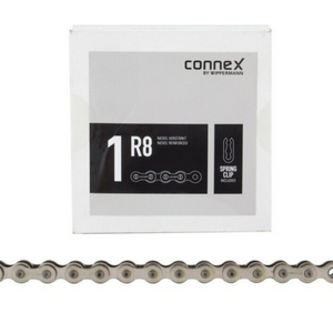 The Wipperman Connex 1R8 nickel reinforced chain is the perfect solution for all cases where the chain is subjected to extraordinary loads: track racing bikes, heavy-duty bikes, velo taxis and military bikes. The high-grade nickel coating reliably protects the 1R8 against corrosion. For all hub gears with wider cogs, fixed gear and single-speed