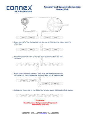 The Wippermann ConneX Chain Link; the legendary, super high quality chain connector – chains can be easily and securely assembled and disassembled for service without any tools. The ConneX Link chain connector is re-usable. Versions available for 9s, 10s, 11s and 12s systems. Attention: follow instructions for the ConneX link correct orientation during chain installation, required for smooth operation. (see assembly instructions/diagram)