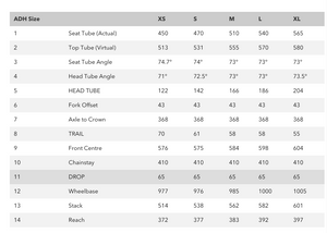 | 1 | Seat Tube (Actual) | 450 | 470 | 510 | 540 | 565 |