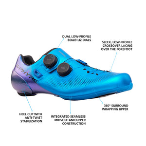 The new Shimano S-PHYRE RC9 is the pinnacle of the modern road racing shoe. A super high performance race shoe. A full carbon fibre sole makes it one of the stiffest shoes on the market, and alongside the anti-twist heel cup and the 360° surround wrapping upper, the 903 S-PHYRE has a superb locked in fit. The new BOA Li2 dial allows for both tightening and loosening the dial via micro-adjust.