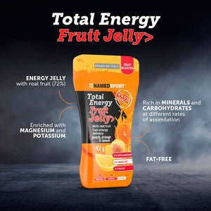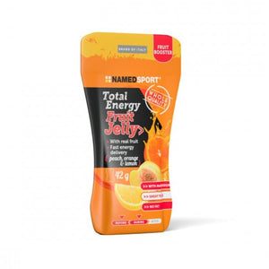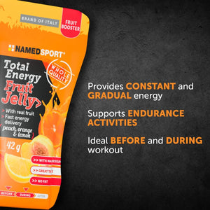 NamedSport Total Energy Fruit Jelly packs are a fruit-based energy product enriched with magnesium and potassium, tasty and easy to digest, perfect for pre- and during workout in endurance sports.  Fast energy delivery. Great taste with 72% real fruit: peach, orange and lemon. Provides energy before or during a training session or race event.