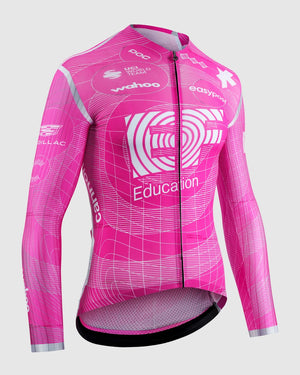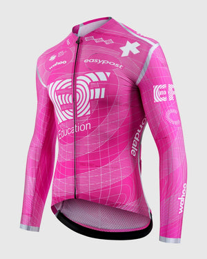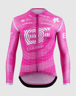 The ASSOS EQUIPE RS LS Jersey S11 EF WorldTour pro-team racing jersey, equipped with the EF Pro Cycling Team’s updated graphics and engineered with long sleeves for full-length aerodynamics that mirror a skinsuit in summer or provide light coverage in temperate spring and fall conditions.