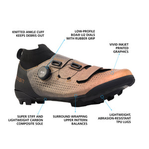 A purebred gravel racing shoe designed to be as fast and light as a road shoe, while maintaining the comfort and durability of a mountain bike shoe. The RX8 series from Shimano gets a fresh redesign and BOA's new Li2 dial, which allows for a micro-adjust both to tighten and loosen the shoe. A full carbon composite sole keeps the shoe stiff for when you put power through the pedals. A shoe made for xc, cross, gravel races, and those long gravel events, the RX8R does it all.