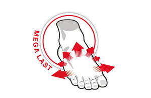 This is the MEGA (wide-fit) version of this shoe: 4 mm wider across the ball of the foot, more volume, a high instep and a wider heel cup.