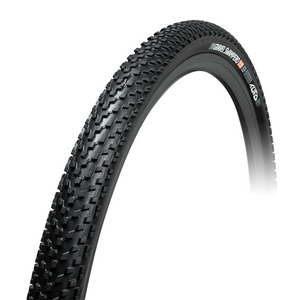 A directional arrow-shaped tread pattern with overlapping central knobs guarantees fast rolling, exceptional grip and self-cleaning properties. The wide tread and a durable flexible layer covers the sidewalls to protect the tire from receiving damage from gravel/stones. A Puncture proof ply under the tread minimizes the risk of punctures and contributes to the overall reliability of the tire. The high TPI casing construction, together with the soft tread compound, smooths out any surface and reduces tire bounce on uneven surfaces. The Gravel Swampero is designed to be a durable high mileage tire.