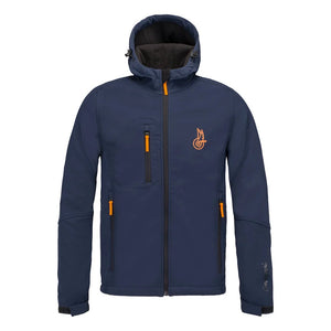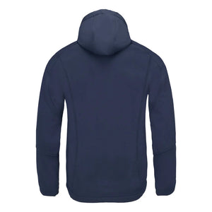 The Campagnolo Winged Logo Soft-Shell Jacket featuring a light streamlined look, in water and windproof Tech Softshell. With zip fastening and adjustable hood, it has two zippered side pockets and ergonomic sleeves for freedom of movement. There is also an additional zipped external front pocket and inside is another zipped storage pocket. An adjustable internal waist cinch allows for a customized fit. The jacket is embellished with Campagnolo logos printed on the side, front and left sleeve. A 3-layer Soft-Shell technical jacket. Available color: Navy Blue. Unisex item.