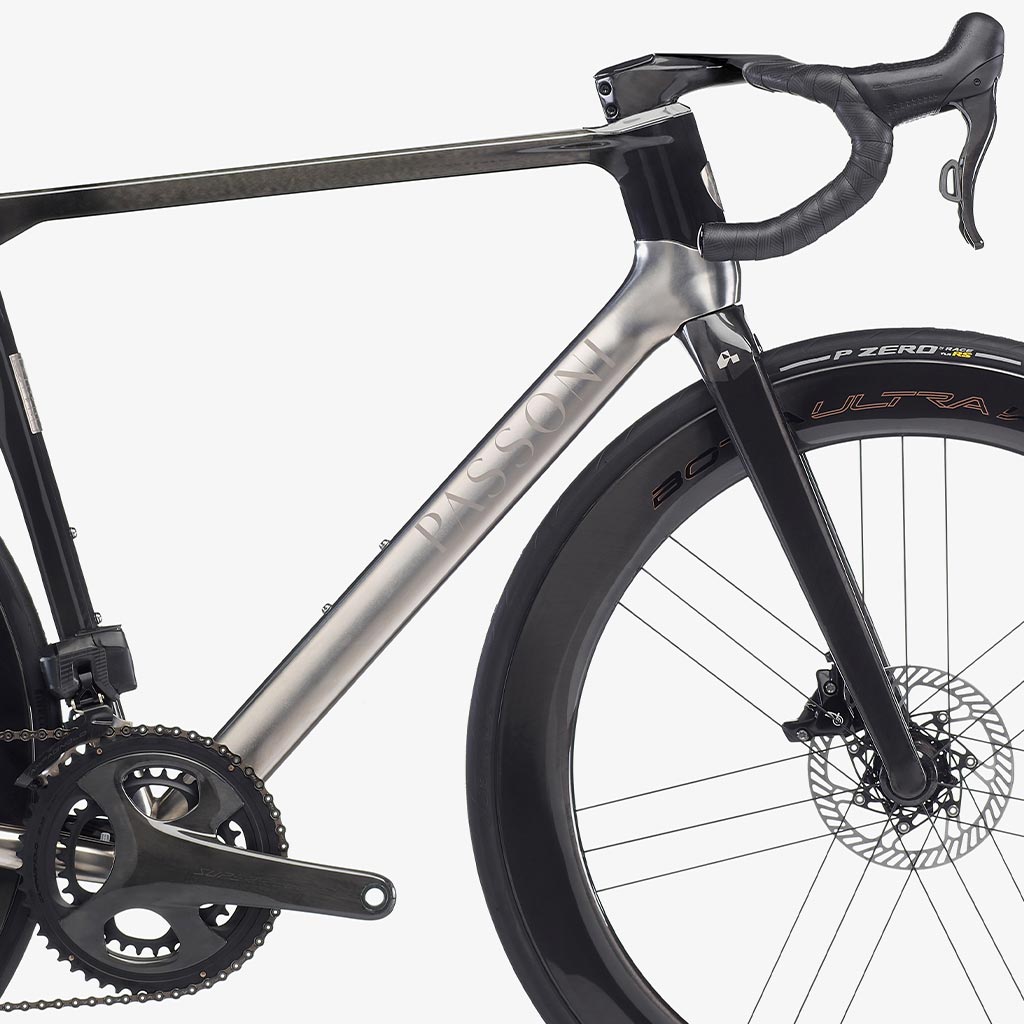 The AT-01 Animus Titanium introduces a hybrid architecture: a titanium lower triangle ensures power transfer, stability and comfort, while a monocoque carbon upper triangle enables aerodynamic shaping and weight reduction. Each material is used precisely where it performs best, joined in a seamless structure that reflects Passoni’s pursuit of balance between efficiency and emotion.