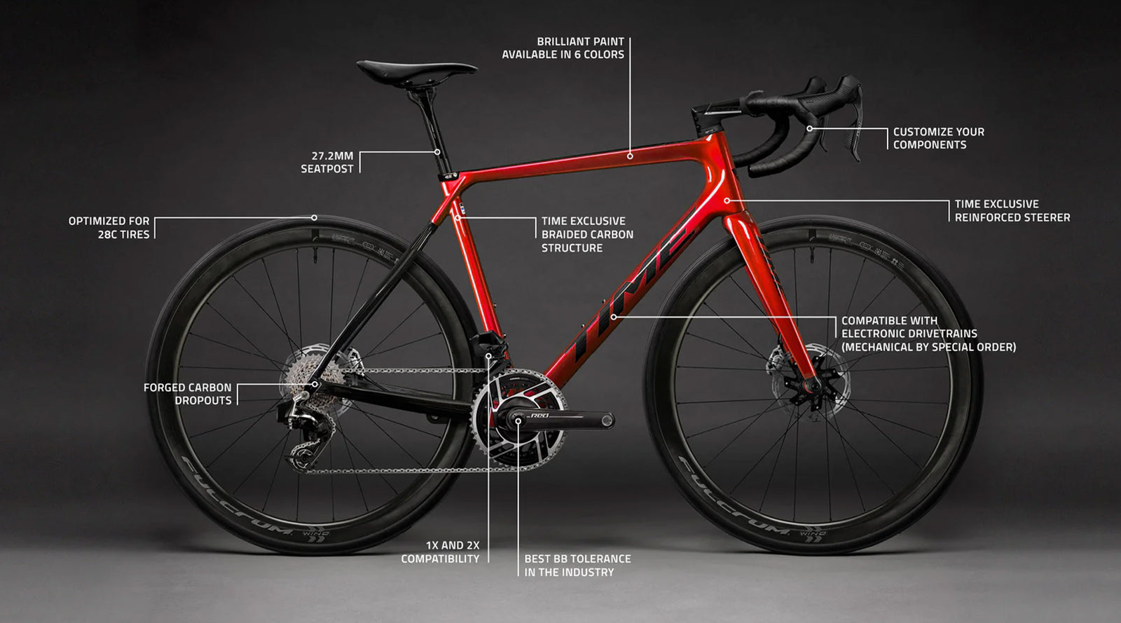 Both the Braided Carbon Structure and Resin Transfer Moulding processes allow TIME to control every individual strand of carbon used in the construction of a frame. With more than 30 years experience of TIME have elevated the standard in creating carbon fibre to match the level found in Formula One.