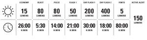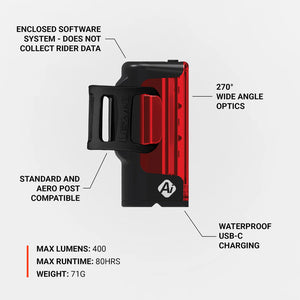 The lightweight and durable co-molded construction with wide angle optics for 270° of visibility, offers 7 combined solid and flash output modes- from the highly disruptive max 400 lumens emitted in Day Flash mode to the impressive 80 hours of runtime in FEMTO mode. A versatile silicone rubber mounting strap attaches to aero or round seat posts. Rigorously tested to IPX7 Waterproofing standards to ensure functionality in the toughest weather conditions. The light also features a 1900 mAh battery capacity and USB-C waterproof charging port (cable not included).