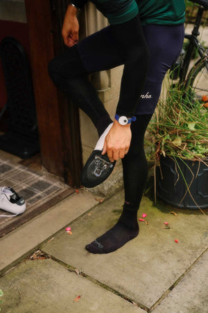A stable of professional riders for decades, leg warmers extend the year-round versatility of your favourite summer bib shorts. And if the weather warms up mid-ride, you can even take them off to make sure you don’t overheat. Made with a high-stretch fabric with a brushed back inner, our Thermal Leg Warmers provide an impressive level of added insulation, wick sweat away from the skin and provide excellent breathability to help regulate your temperature. Seams have been carefully positioned to avoid bunching behind the knee while the robust, elasticated gripper sits comfortably beneath your bib shorts and provides a secure fit around the thigh. A pink tab makes taking the warmers on and off easy, and there’s a contrast Rapha logo on the calf for added visibility.